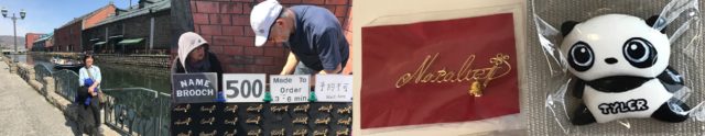 小樽离札幌约40分钟车程,古老的小樽运河上有游客在坐游船,旁边是古老的仓库群,,运河边上有不少街头艺人贩卖手工艺术品,我们幸运地遇上了一位制作姓名别针的日本艺人,即场用渡上金色的铜线熟练地制作出我们所需的名字,一个500日元,平均大约6分钟做一个,这是我此行的最大收获,也是我孙儿女们最喜欢的礼物。