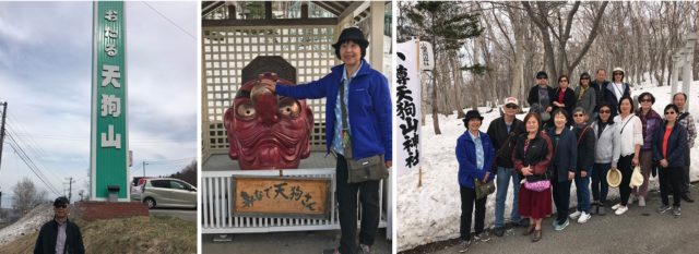 在小樽市区有许多店铺包括有名的八音盒博物馆,逛街购物是我们所爱,逛完后乘坐缆车上天狗山,在山顶可俯瞰小樽市。冬天这里是个很好玩的滑雪场地,我们四月中旬到此,山上还有些残雪,山上有一处天狗的塑像,导游说摸摸天狗,吉运当头,大家都跟风去触摸并照相留念。