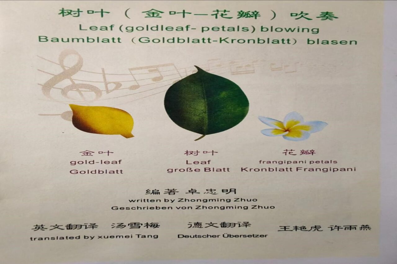 我回赠他一册用中-英-德文编著的非遗“树叶(金叶-花瓣)吹奏”教程,和衍生的乐器。