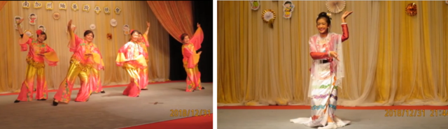 左: 汉族集体舞,右:缅甸女生单人舞