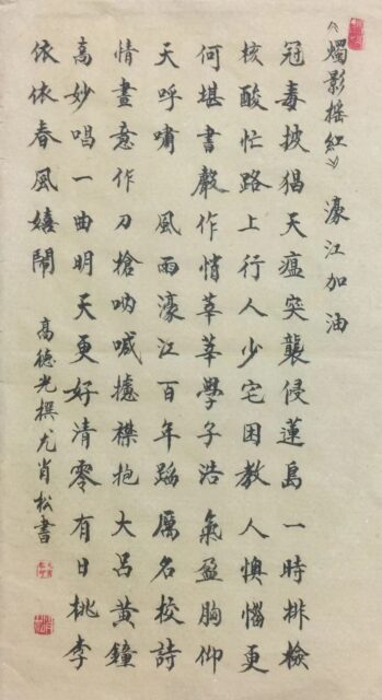 百年名校澳門濠江英才學校師生以《明天會更好》這一樂曲作主旋律制作了“同聲相應,澳門必勝”MV傳之上網,為抗疫鼓呼,賦詩以紀其盛。
