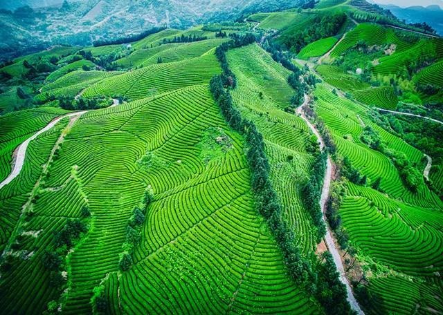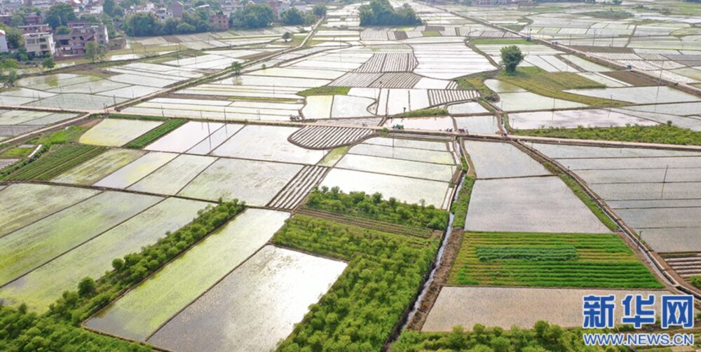春耕处,日照田园,片片水田晶亮。