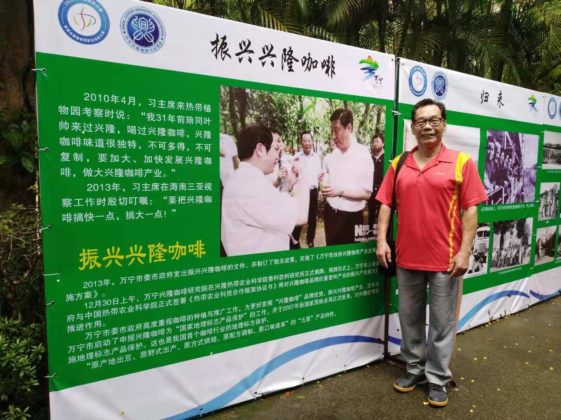 作者卓叶在兴隆热带花园“习近平总书记视察兴隆”宣传图片前的留影