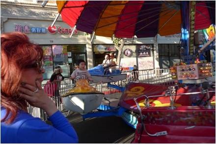 约下午2时, 笔者再次回到园区, 只见周围大街小巷, 停满无数车辆, 好不容易才找到一个空位, 一进园内, 到处是人山人海, 游客接踵擦肩, 可谓水泄不通, 有的选购商品, 有的观看表演, 游乐场里孩童们欢天喜地, 尽情玩耍, 许许多多的摊位前, 游客们排长龙转旋盘, 免费领取大小礼品。有两位女士, 各自双手提着大小包裹, 一个笑言自己已买一百多元, 一个乐道自己记不清买了多少元, 除游乐场里的孩童, 几乎无人空着手。