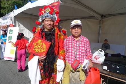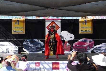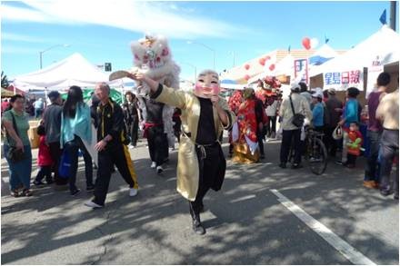 是日天亮前, 当地警察早已将山谷大道约五百米路段封闭, 各庆祝团队及商家赶在天亮时集结佈置就绪。笔者上午9时许赶到现场, 自西至东首先进入眼簾的是飞龙等电动游乐场, 由于时间尚早, 还沒有多少儿童进入。接着是连绵不断, 左右并列的小摊位, 有推销各种餅盒, 食品的, 厨房用品的, 家庭生活用品的, 均比平时价格优惠, 品种齐全, 琳瑯满目, 吸引游客, 已开始有三, 五成群游客在选购。到了正中, 中心有午台, 各演出队伍, 粉飾彩装, 磨拳擦掌, 集中待演。再过去是美食餐飲店, 各种美食热气腾腾, 香味扑鼻, 令人垂涎, 已开始有人进出。往前走是优惠照相, 花草盆栽, 服装首飾, 净水设备, 中文纲络影视, 銀行开户, 家电手机, 医疗保健, 总之, 种类繁多, 数不胜数。