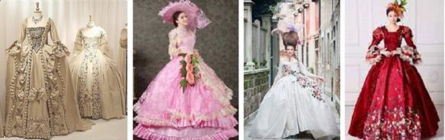 在女僕的協助下,小心翼翼的終於把她穿上了。那時還未發明拉鏈,女僕耐心的把她衣服後面那二三十個小小的鈕扣一一扣上。頭髮早已弄好,是用大鐵鉗在火炭上燒熱,然後把頭髮卷成一圈圈的波浪,配上許多小巧的蝴蝶結。臉部也經過精細的化妝,手指甲和腳趾甲在幾天前已用胭脂花汁染成桃紅色。
