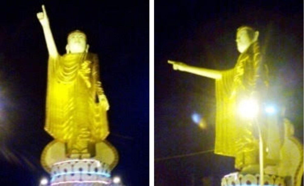 在城中一高处,耸立着一尊高30多米的直立通体馏金的佛像,它的头顶上镶嵌著几公斤的黄金。为景栋标志性景观和人们观光游览圣地。