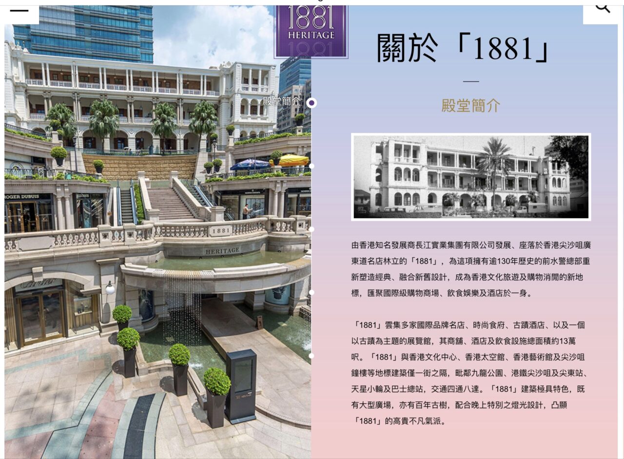 【註】「一八八一」位於香港九龍尖沙咀廣東道二號,原址係前水警總部主樓、馬廄、時間球塔、九龍消防局及九龍消防局宿舍五幢建築。其外貌古典而大氣,有具國際級品牌商鋪、老香港獨特風貌酒店及展覽廳,為香港文化旅遊休閒新地標。因建於1881年而得名。