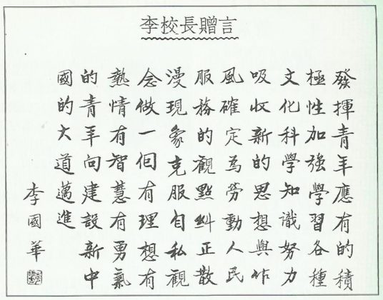 师恩难忘。我们永远也忘不了老师们的谆谆教诲,沒有他們呕心沥血的培育,那有我们的今天。在诸多良师中,李国华校长是一个典范。