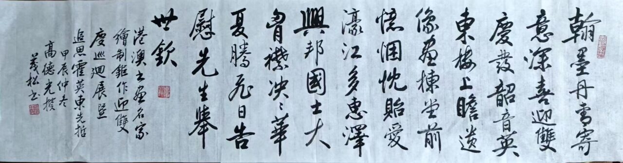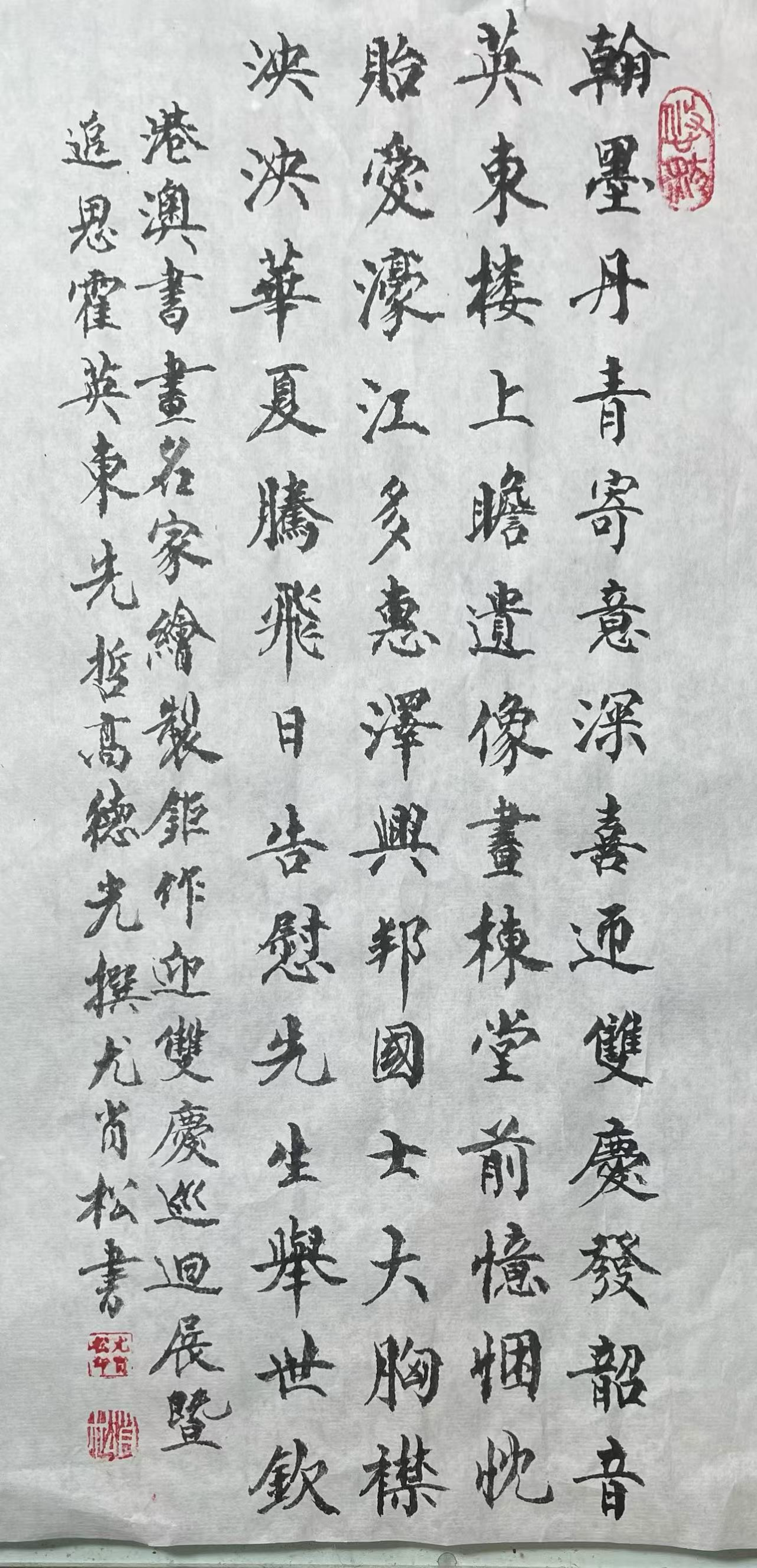 . . 華夏文明今古傳, 楚辭漢賦宋唐篇。 濠江薈萃吟風雅, 葡韻悠揚入管絃。 融滙中西相碰撞, 切磋音律共承宣。 好將世界詩歌節, 砥礪騷壇笑比肩。 书法 一〉馮利發 二〉劉北照 三〉茂松 四〉黎勝培 五〉周永騰 六〉吳錦蓮...