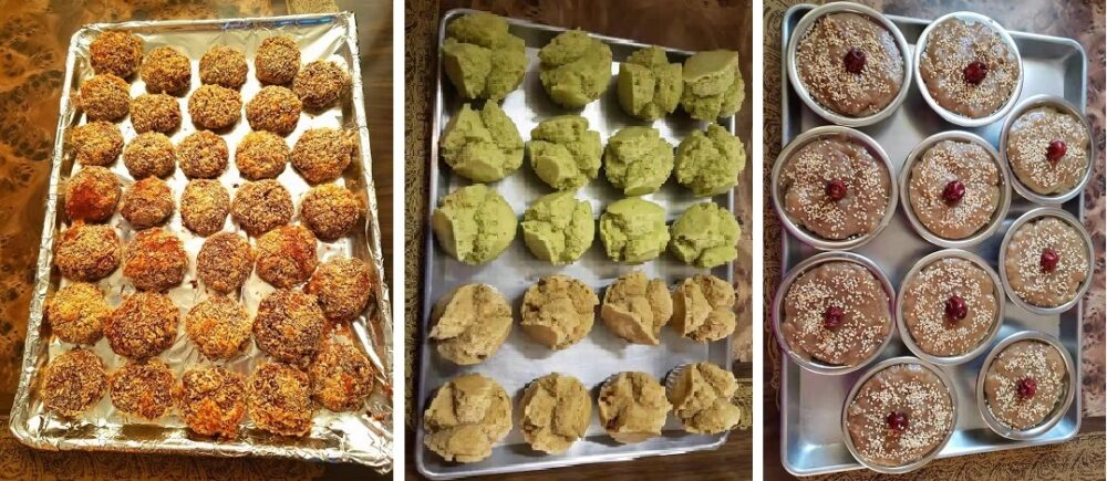 左:烘焙牛肉饼,中:两色发糕,右:手擂糯米年糕
