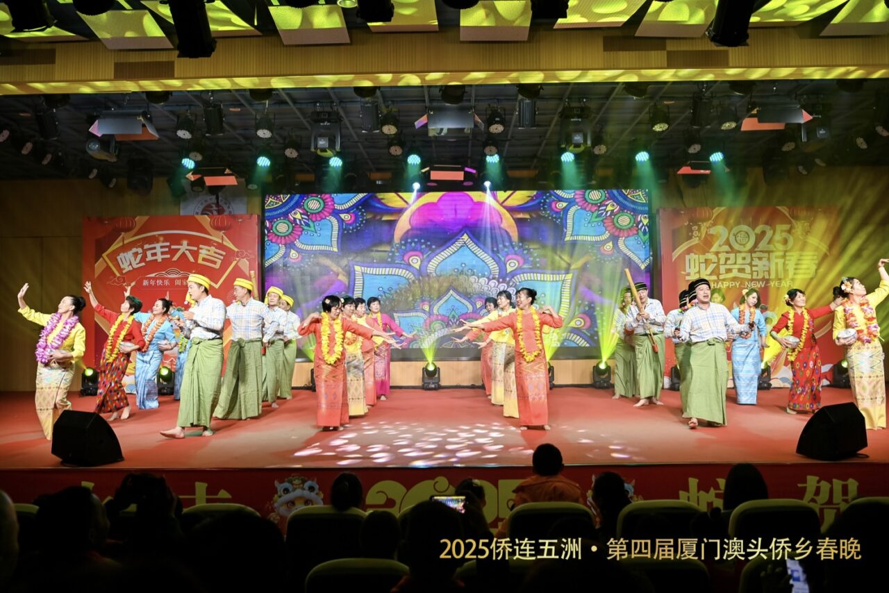 在欢度灵蛇迎春的新年里,厦门缅甸归侨联谊会文艺队,献上独具缅甸特色的歌舞,与全球侨胞及港澳台同胞欢度新年,共贺新春。当欢快的缅甸歌曲传来,缅甸象脚鼓及乐器的响声,伴随五彩缤纷闪烁的背景屏及灯光,胞波们踏着婀娜的舞步缓缓而来……银钵里的圣水泼淋着,每一个转身、每一个翻腕、每一次回眸……淋漓尽致展现了缅甸舞蹈的独特魅力。