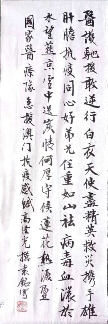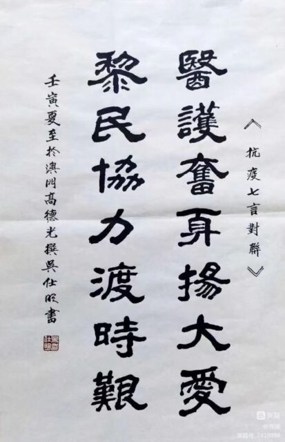 澳門經過一個多月的抗疫,嚴防嚴控已初見曙光,期間詩書畫界同仁拿起筆杆作刀槍助力抗疫,社會上泛起了陣陣漣漪,起到了很好的鼓舞作用。茲收錄了部分書法作品公諸同好,冀大家日後繼續共同努力。