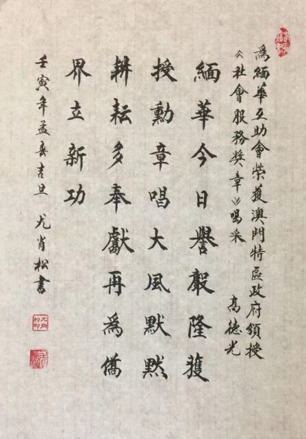 . . 華夏文明今古傳, 楚辭漢賦宋唐篇。 濠江薈萃吟風雅, 葡韻悠揚入管絃。 融滙中西相碰撞, 切磋音律共承宣。 好將世界詩歌節, 砥礪騷壇笑比肩。 书法 一〉馮利發 二〉劉北照 三〉茂松 四〉黎勝培 五〉周永騰 六〉吳錦蓮...