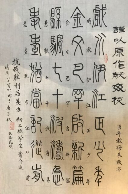 胜利后後复办初三班 学生萧介达 谨书 时年八十有四 庚子秋 雲南昆明