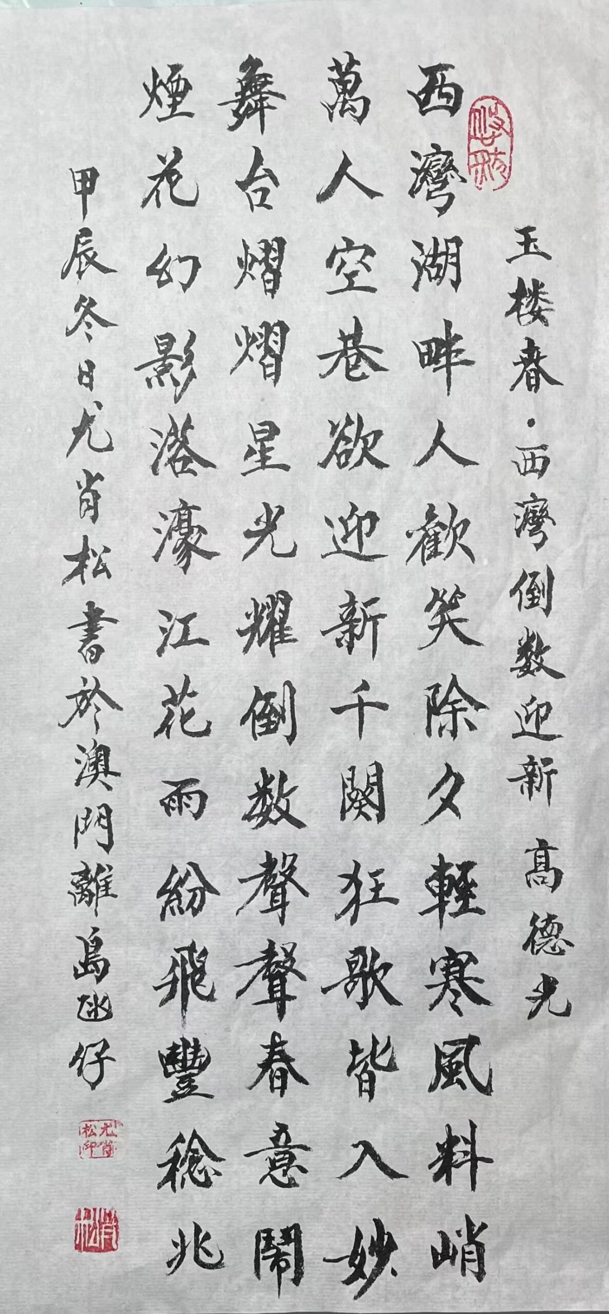 . . 華夏文明今古傳, 楚辭漢賦宋唐篇。 濠江薈萃吟風雅, 葡韻悠揚入管絃。 融滙中西相碰撞, 切磋音律共承宣。 好將世界詩歌節, 砥礪騷壇笑比肩。 书法 一〉馮利發 二〉劉北照 三〉茂松 四〉黎勝培 五〉周永騰 六〉吳錦蓮...