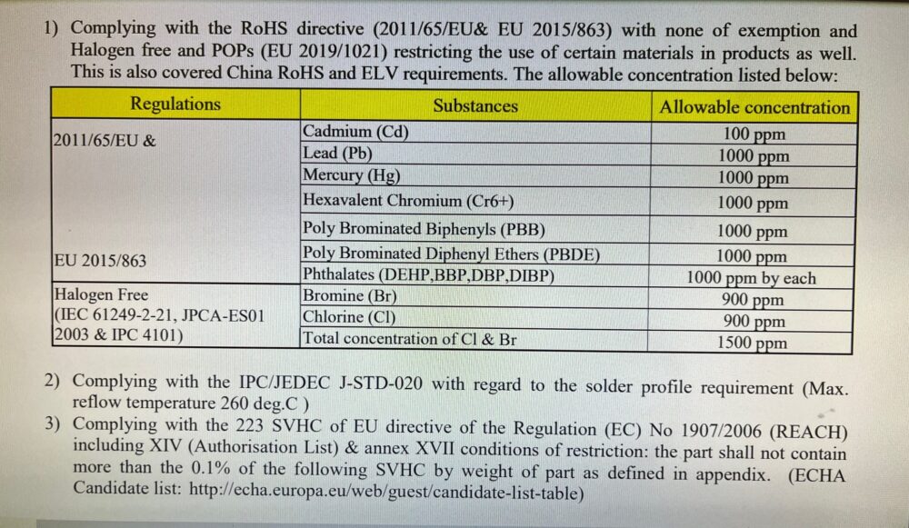 (RoHS =“Restriction of Hazardous Substances in electrical and electronic Equipment”. )以下是:鉛,汞,鎘,CrVI, PBB, PBDE, DEHP, BBP, DIBP, DIBP.等。