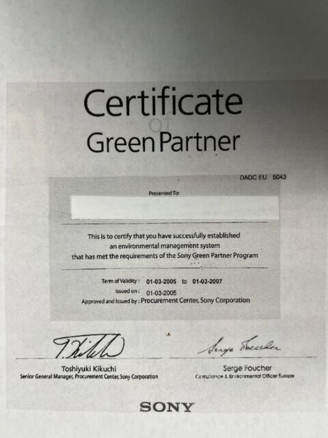For example: Sony Green Partner certificate