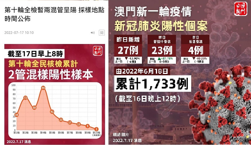 注:澳门疫情首现小区传播,自2022.06.18以来至今2022.07·16累积阳性个案1733,现正进行第十轮全民核酸检测。澳门新型冠犾病毒感染应变协调中心已宣布即将开展7月18日至23日将进行第11,12和13轮全民检测 ,每两曰为一轮。每轮参全民核检人数约66万人次。每轮核检阳性𠆤䅁数由大趋向小。