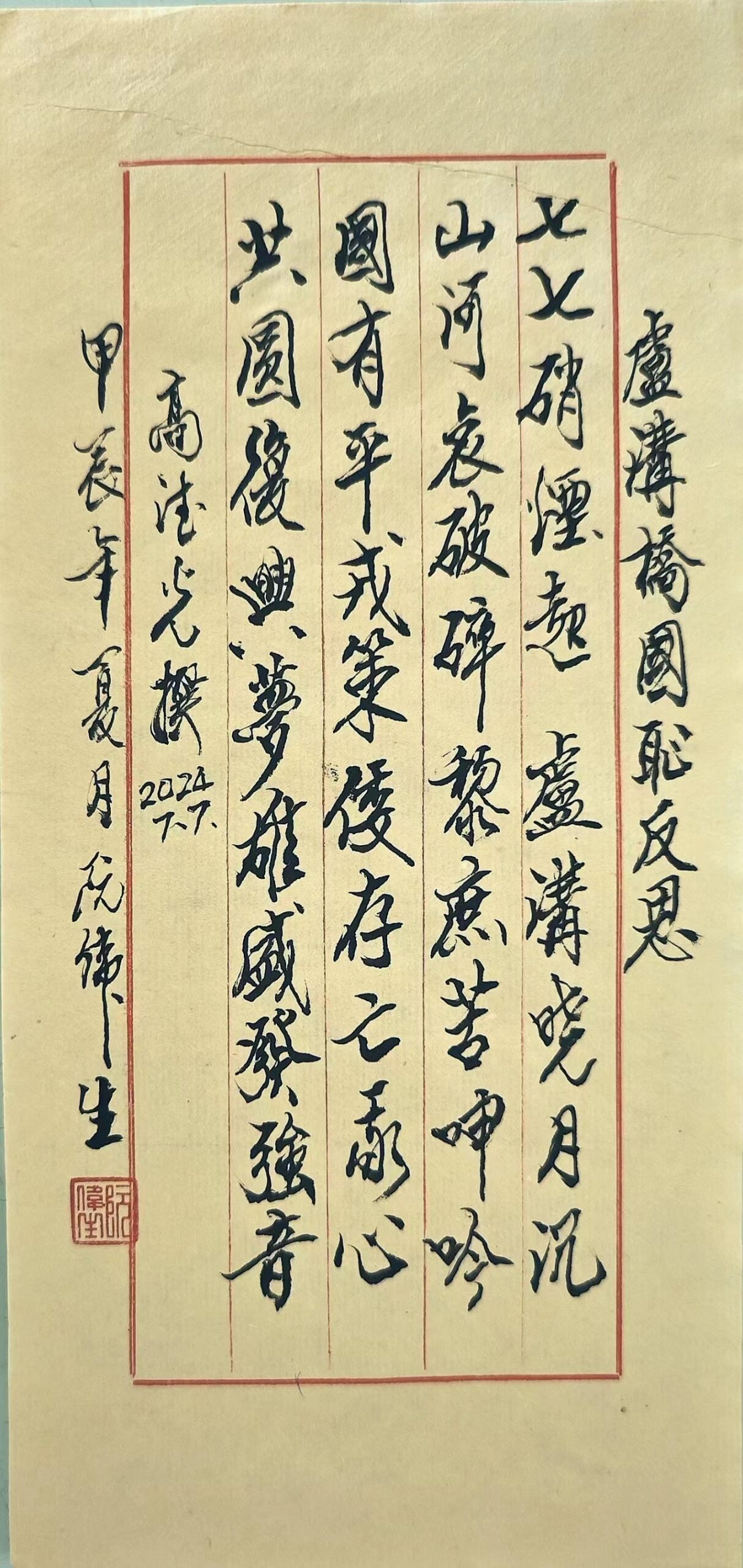 . 南昌首義響槍聲, 八一軍旗血染成。 百鍊鋒芒圖報國, 千秋功業在強兵。 河山收復披肝膽, 社稷安危輕死生。 縱目寰區聞戰伐, 礪戈秣馬作干城。 . 书法 一〉茂松 二〉龔正中 三〉阮偉生 四〉劉北照 五〉阮偉生 六〉黃玉靈...