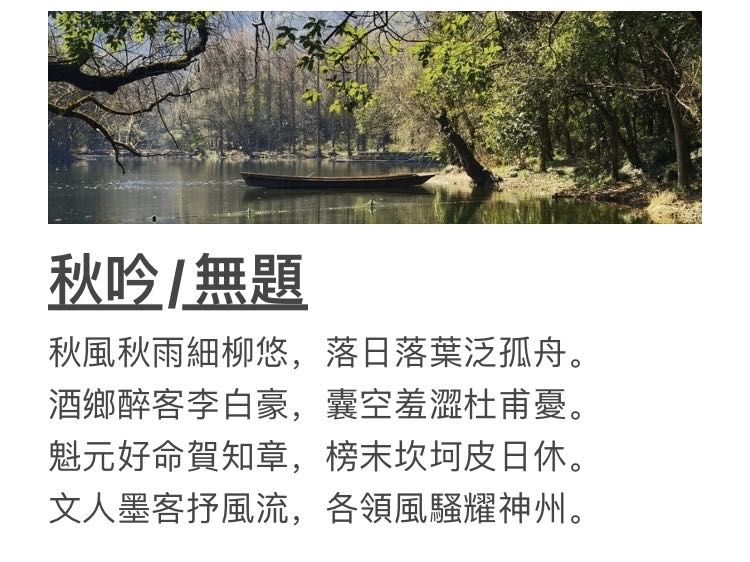 秋風秋雨细柳悠,落日落葉泛孤舟。