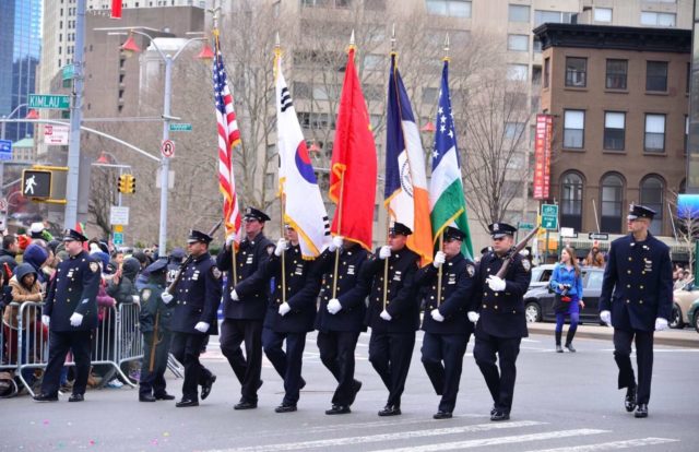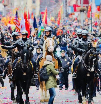 大約中午一點多,由紐約五名騎警開路,騎警颯爽英姿,好不威風,其后警隊跟隨,手持中美國旗、迎風飄揚、連消防局也參予了活動;造型各異的花車緩緩而行,花車美侖美奐:有星島日報花車的巨型財神海報、兩位財神在所到之處隨機向民眾派發紅包,並送上最美好的新年祝福,人人歡欣雀躍;世界日報滿車的紅色汽球隨風飄浮、搖曵生輝、金穗造型的丰收滿載、象徵着風調雨順;蘇格蘭樂團穿著傳統服裙吹奏助陣遊行,音樂嘹亮悅耳、步伐豪邁整齊、引人注目;還有男女童軍、學生隊伍,耍弄之間溢滿着年少有為的強烈青春氣息;價值不菲的古董車、超新型跑車、豪車也閃亮登場,倍增意外驚喜、令人遐想連篇,大開眼界;坐在古董車或花車上、華裔小姐們的風姿卓約、增添了無限姿彩;花車上載歌載舞,節目服飾亮麗,賞心悅目。遊行隊伍中:美洲熱舞、扇子舞、旗袍秀、跆拳道……等等都目不遐給、各自精彩;兩條巨籠和舞獅隊,別出心裁,氣勢恢宏的迂廻環繞穿梭、靈活靈現;矯健的舞獅窜上跳下,引人吸晴;放眼一看,哇!不遠處,齊天大聖孫悟空也來了,正在尋覓牠的豬八戒師弟呢!原來貪玩的師弟換了漂亮新裝,夾在一群可愛的小豬間共同戲耍遊行了,別忘了,這是牠們的本命年,當然也會盡情享受歡樂吧!……一切一切,不同往年,都是令人驚訝的視覺盛宴。夾道之間觀眾人頭湧湧、群情激動萬分,紛紛搖旗喝彩助陣,頻頻和遊行隊伍互动,炮竹震天響,彩片和絲帶漫天飛舞,落在人人身上、感覺沾滿了無限喜氣、笑意特別陽光燦爛;滿地的七色碎紙,絢麗班爛,置身其中,情趣更濃,當天的華埠,熱鬧盛況空前。隊伍從勿街出發,經過五、六條街,最後在布隆街圆滿結束,群眾還余興未盡、留連忘返,許久才逐漸散去。