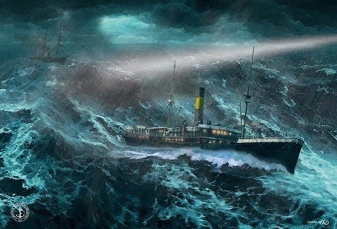 航行于狂风暴雨巨浪中的客货轮船