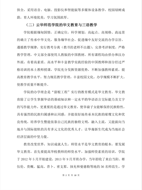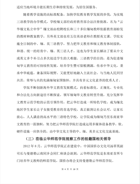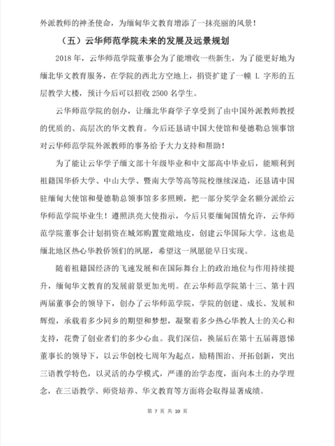 . 缅北华文教育联合会会长尚兴玺先生一行到曼德勒云华师范学院看望在校师生 . 缅甸华文教育作为海外历史攸久,复蓋面最广,植根最深,基础最牢的中华语言文化基礎教育,是中华民族在海外的留根工程是中华文化在世界传播的希望工程也是缅甸华人华侨最重要的民生工程。隨着中国经济的快速崛起,祖籍国髙度关注广大华人华侨在海外的生存和发展,大力支持开展海外华文教育,着力开创中华文化不断增强国际影响力的新局面,顺应历史潮流,与時俱进,在高瞻远瞩,睿智英明的尚兴玺会长领导的曼德勒云南同乡会十三届理监事会的统筹之下,在国侨办,云南省侨办和中国驻缅甸大使馆和曼德勒总领事馆的支持和指导下,在广大热心华教的侨领们的鼎力支持和慷慨输捐下,综合集成国内外各方资源,创办了缅甸云华师范学院,云华师范学院是一所集教学和文化交流为一体,以培養华校语文,数学教师为主,附属三语全曰制幼稚园,小学,中学至髙中基础教育为一体的,非盈利性的,福利社会的三语教学模式的综合院校,主旨是开展华文教育,传承中华文化,兴办缅文中学,促进缅中友好,尊遁德,智,体並育的教学理念,以面向当地,传承祖籍,放眼世界的办校方针,努力构建开放,文明,多元互动的和谐校园,为每位学生的终身发展搭建坚实的平台。学院占地3.3英亩,校国环境优美,六层椭圆型教学大楼宏伟雄秀,实验室,电脑室,音乐厅,一应俱全,彩塑跑道和多个灯光篮球场,排球埸供学生练习,校园绿树成荫,育人环境优美,学习氛围浓厚,采用语音,电脑,投影仪和智能板等现代化多媒体教学。学院秉承传承中华文化,服务缅华社会,促进缅中友好交流的办学宗旨,尊循教学规律,实行教考分离,完善和规范考试制度,严格教学管理,中文部全部使用中国教材,所有课程均由有着高水平,髙素质的教学实践经验丰富的中国外派教师授课,使用汉语拼音和简体字,培养学生都能讲一口流利的普通话,充分发挥资源优势,不断加强教师素质,提髙教育教学水平, 向着现代化、科学化、规范化方向转型升级,坚持三语教学特色的办学发展道路,学校缅文部经政府教育部合法注册批准(云华缅文私立学校高中部已于今年5月底获批准并已取得营业执照)名为云华缅文私立中学学院实施全日制的中、缅、 英三语教学,努力把华文教育和缅文教育体制接轨、和谐、统一的培育中、缅、英三语人才,努力把云华师范学院打造成由中华文化主导的中、缅、英多元文化交流基地!三语教学的目的,是为促进缅甸华文教育的可持续性发展,让学生旣可留根溯源,传承中华文化,秉承中华底蕴,兼备国际视野,又能更好的融入主流社会,与当地人民冋甘共苦,荣辱与共的充满缅甸家国情怀,并具有多元文化素养的优秀人才!教育改变世界,知识成就人生,师资水平是华文教育的根本,缅甸的华文教育,是语言文字的教育,也是知识的教育和中华文化的教育,由于历史原因,缅甸的华文教育曾经有过三十多年的断层,导致师资严重缺乏,要发展华文教育, 首先要提髙华文教师的师资水平,加强教师教学素质的培训,时代在发展,社会在进步,缅甸华文教育不能停留在让学生只识几个汉字,会说几句中国话的这个低层次的旧的框框里。 随着祖籍国国际影响力和国际地位的不断提髙和一带一路倡仪的实施,华文教育迎来了新的机遇,它加强了中缅双边文化交流和商业贸易往耒,对中华语言文化的认冋和传承的需求更加强烈,对华文教育的层次和水平要求不断提髙,中资企业越来越多的到缅甸投资,当地华人及中国企业的未来发展需要更多的三语人才,在人才市场上,懂华语和缅语的员工的待遇要髙於不懂华语的!云华师范学院为缅北各华校培養有一定教学水平的本土教师,对缅北各边远地区来就读的师范部学生,实行两免一补二包的方针,即免学费,免住宿费,补贴伙食费,毕业后包分配工作,工资包底薪。让学生无后顾之忧,为缅甸华文教育可持续发展提供有力保障!第一届师范部学生51名,第二届68名,第三届67名,第四届63名,第五届107名完成了在云华的课程后,到祖籍国继续深造后也已毕业,已有356名的毕业生参加各种工作和教师团队,充实到缅甸各华校服务,成为新的生力軍,为缅甸的华文教育帶来了新的动力!文化是民族的血脉,中华文化是海内外中华儿女世代自強不息,团结奋斗的強大精神支柱,华文教育不仅维系着华人华侨的民族特性和与祖籍国的情感连系和精神纽帶,还承载着加強与缅甸主流社会和民間的友好关係!云华师范学实施的华文教育,除了让学生撑握华语的基础知识和一定水平的华语语言的交际能力及文字的写作能力外,更重要的是通过华文教育,使华裔子女能够保持本民族特性,具有强烈的民族归属感和认同感,并能很好的传承本民族的璀灿文化和优良传统,培養学生既能依靠自已民族的独特文明又能面向当地并与世界接轨的具有多元文化的优秀人才,让华裔新生代成为当地社会的中坚力量!随着祖籍国经济实力和政治影响力的不断提升,随着一帶一路倡仪的实施,缅甸华文教育迎来了新的历史机遇,被赋予了新的時代内涵,一帶一路倡仪的共商,共建,共享策略,各国政府对华文教育的政策也会有所转变,隨着汉语教学在缅甸已经深入政府各大专院校及各地孤儿院及各寺廟教学点,海外华文教育已经成为构筑世界华人命运共同体,乃至人類命运共同体重