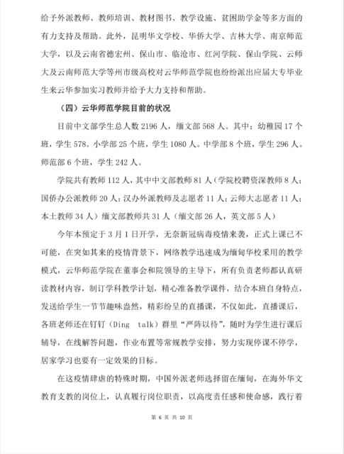 2020年年末中国驻缅甸大使舘向缅甸获得 “海外示范学校” 的二十六所华校要求上报学校简介,缅甸云华师范学院为其中之一。