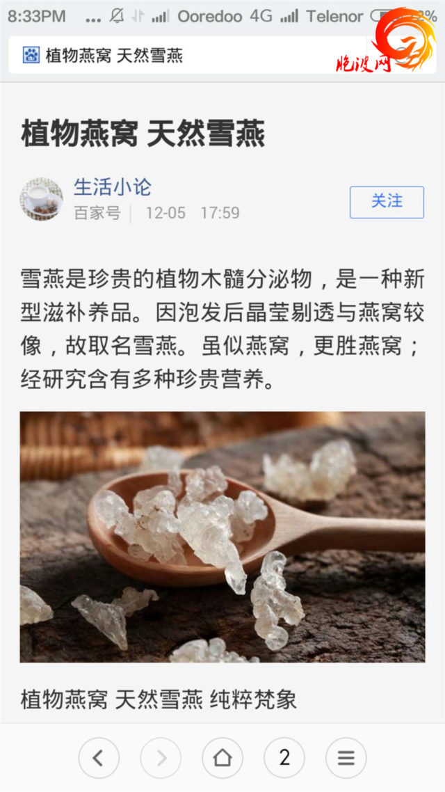 植物学名称叫 ( Sterculia Versicolour),中文称 花斑苹婆的植物,来源于梧桐科苹婆,是热带的一种野生植物,贵于它的木髄的分泌物树脂;起初人们只知道将其透明团状的树脂泡水后饮用,中国人一般称之为雪燕或植物燕窝 ( 因为泡水拉丝后形状非常与燕窝相似 );据科学研究后,它的营养价值远远超过燕窝,但目前只限于鲜为人知状态……若想买到纯粹的雪燕,必须懂得分辨真假,因为它的形状与一般的树脂没有多大的区别 ( 详情请收查百度)。