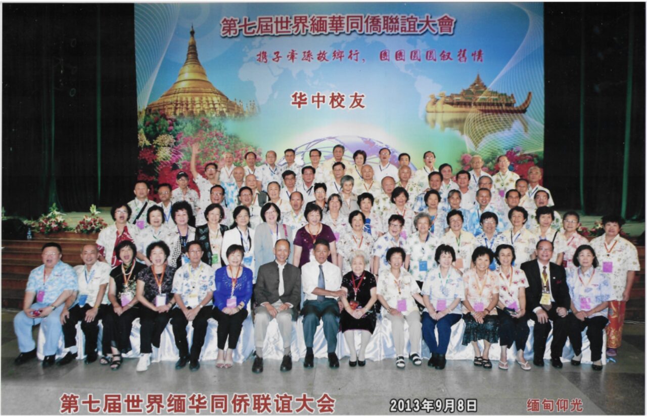 2013年9月8日,粟秀玉教授(前排中间着黑旗袍者)与来自五洲四海的华中校友在第七届世界缅华同侨联谊大会欢聚一堂。