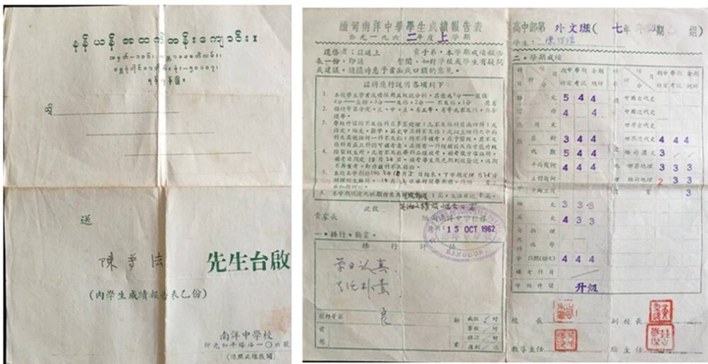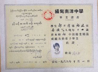 由于缅甸当时首都仰光的华文教育,尤其是缅文,高于“山芭”,存有悬殊。我读南中初中毕业班,缅文赶不上,半期考试“2分”不及格,经父母、老师的鼓励和帮助,我勤奋学习,期末考试终于全科及格,取得初中毕业文凭。
