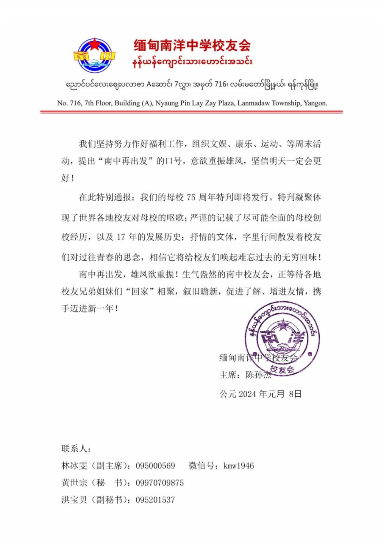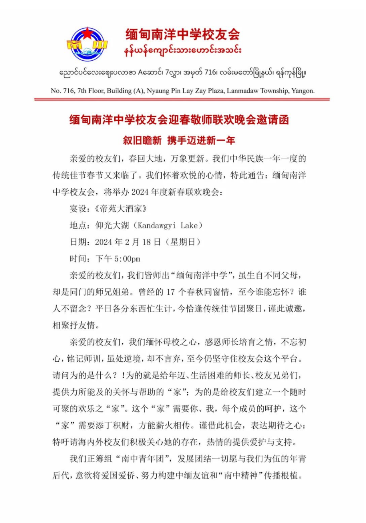 转载请注明:《缅甸南洋中学校友会迎春敬师联欢晚会 邀请函》 复制链接