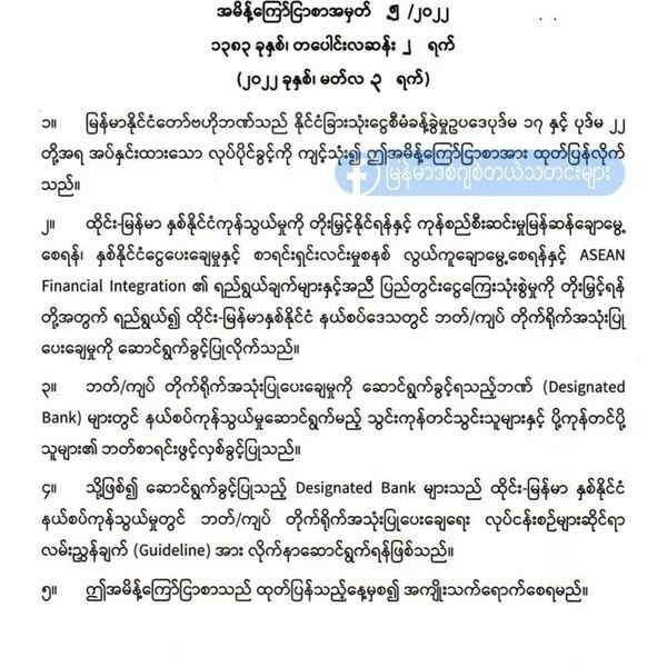 声明中表示,这些指定银行(Designated Bank)必须遵守在缅泰边境贸易中直接使用泰铢/缅币结算的相关规定。