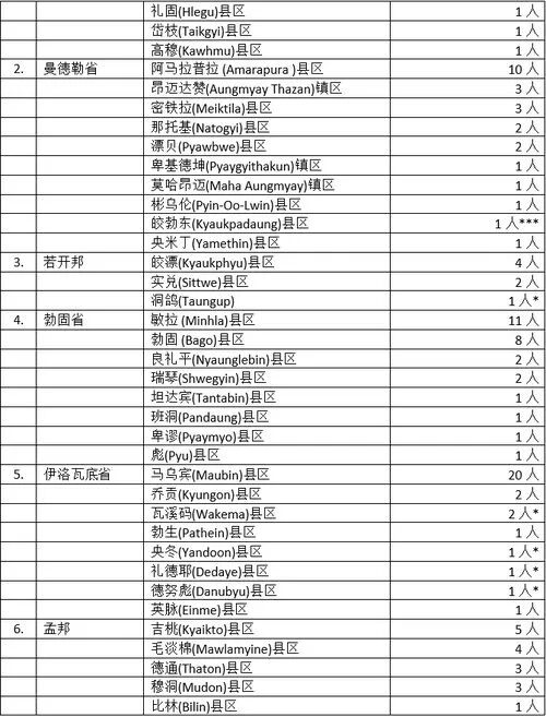 至于其他省邦地区,曼德勒省10县25名确诊者,勃固省8县27名确诊者,伊洛瓦底省8县29名确诊者,孟邦的6县区17名确诊者,都在不同程度上显示出了这4个省邦的疫情的严重性,这4省邦都是在这次疫情第二波遭到严重冲击的地区,曼德勒省的阿马拉普兰、勃固省的勃固及敏拉,伊洛瓦底省的马乌宾,孟邦的毛淡棉及比林也都是疫情的“重灾区”,这些县区的防疫工作仍然面临十分严峻的局面。相比之下,若开邦3县7名确诊者,蔓延情况明显缓和下来了,但愿这缓和情势能继续发展下去。首都内比部地区,也在这第二波疫情中受到严重冲击,现在6县区9名确诊者,其地区的蔓延情况还是不能小视之。至于掸邦南部地区,一向是疫情较平缓的地区,不过近日加强防疫检测工作,确诊人数已有所增长,现在3县区9名确诊者,虽然与其他局势严重的省。邦地区相比算不了什么,但当地人士已感到一阵压力,“这说明疫情第二波也已准备开始向我们地区冲击了。”当地一位社区负责人就这样说道。至于实皆省的5县区7名确诊者,掸邦北部的3县区4名确诊者,马奎省的4县区4名确诊者,有的县区是早就有确诊者的发现了,有的县区却是新近受到感染的,这也说明了疫情感染面积正在扩大之中。剩下的省邦地区,克伦邦2县2名确诊者,钦邦及克钦邦都各为1县1名确诊者,蔓延情况相对比较缓和,但也不能大意,因为“星星之火”,照样可以造成“燎原”的严重局势。
