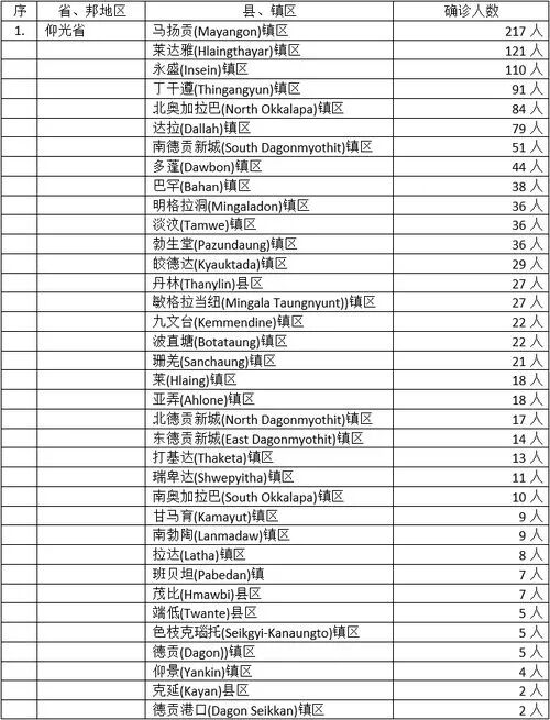 1400名确诊者中,仰光省39个县镇区感染1258人,占总人数的90%,确诊人数比例高而且照样压倒性地居于全缅之冠。其中确诊人数过百的三个镇区分别为马扬贡(217人)、莱达雅(121人)及永盛(110人),马扬贡单日感染人数可能是创下了全缅的记录,莱达雅是著名的工业区所在地,永盛镇则是在第一波疫情时就因一位宗教人士肆无忌惮地举行大规模祈祷活动而“声名大噪”,现在在第二波疫情时又几乎是仰光省确诊者最多的镇区,确诊人数据说已超过千人,是疫情“重灾区”之一。