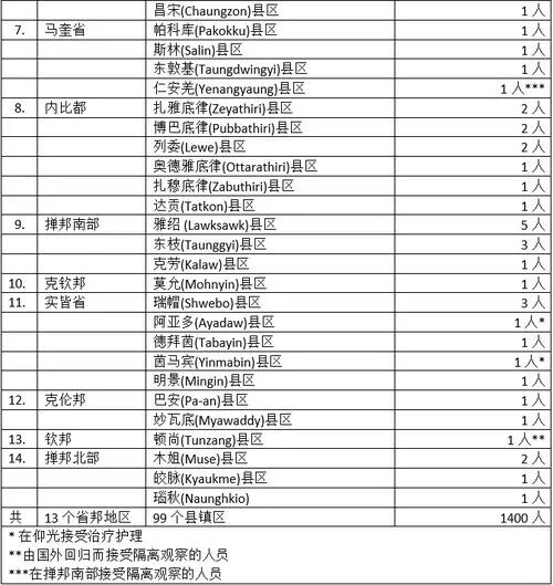 缅甸卫生暨体育部10月8日下午5时发出公告,通告10月7日这一天发现的1400名确诊者的一些情况。这1400名确诊者来自13个省邦地区,他们所属的县镇地区如下: