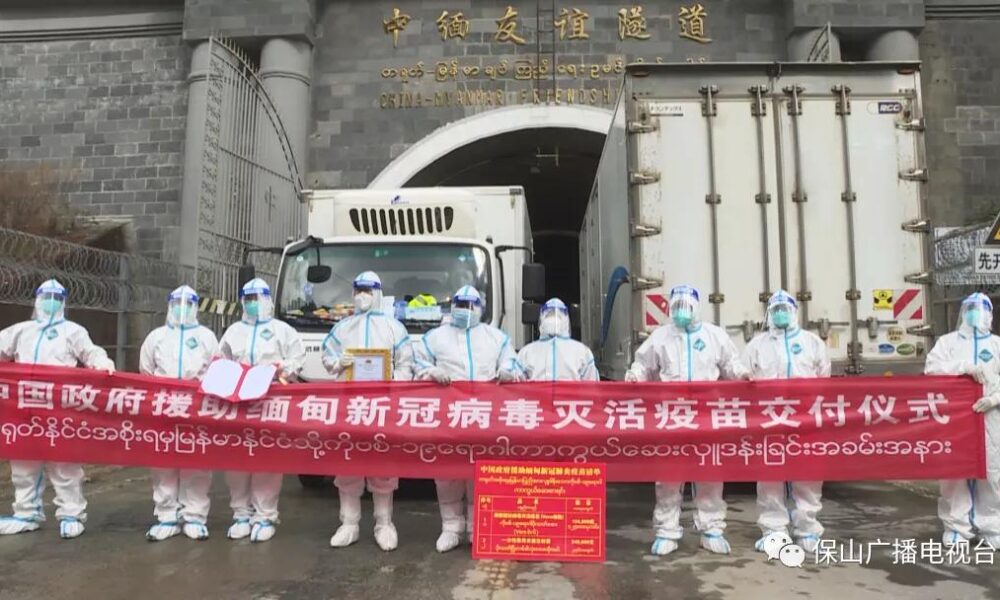 2021年12月,中国政府决定向缅甸北部地区提供新一批100万剂北京科兴新冠肺炎疫苗抗疫援助。2022年1月10日,首批次74.68万剂疫苗从北京运抵昆明。1月11日,启运仪式结束后,疫苗被运送至西双版纳、德宏、临沧、保山、普洱等沿缅边境五个州市。1月12日,五州市分别在打洛、瑞丽、盈江、章凤、南伞、猴桥、孟连等7个口岸举行交付仪式,将新冠肺炎疫苗顺利交付缅方。