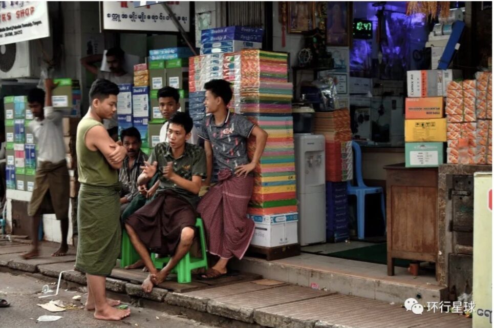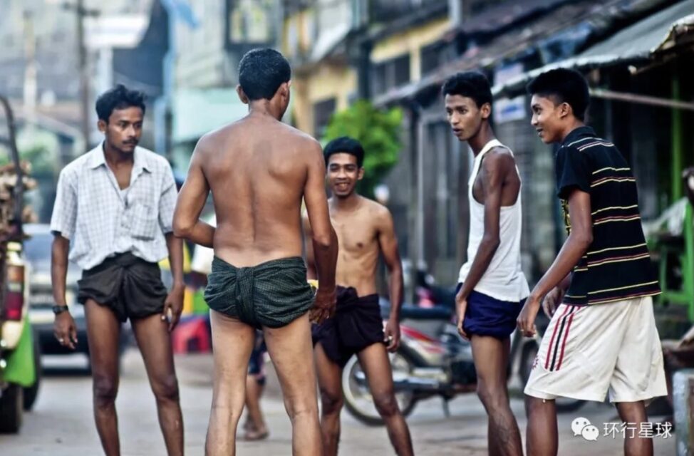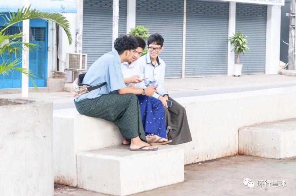 仰光街头,几个年轻人穿着传统笼基
