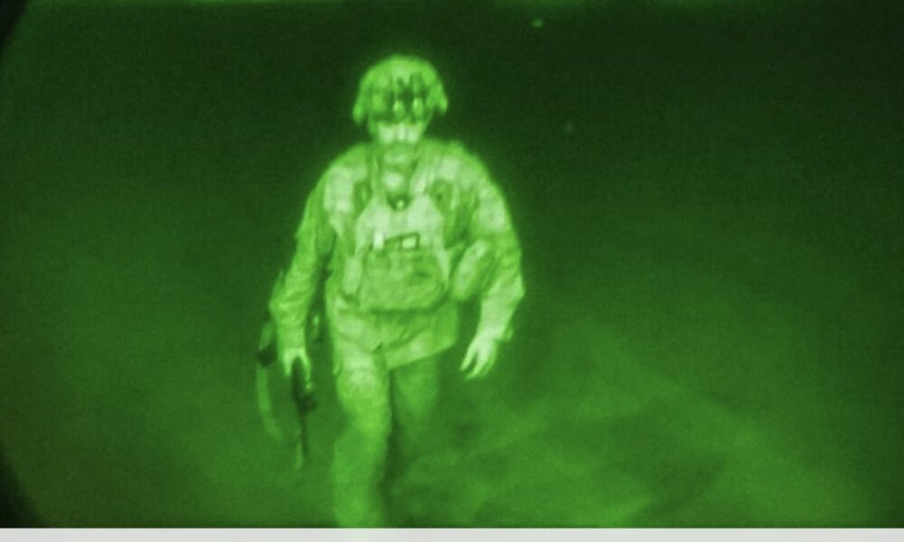 8月31日消息,美国中央司令部公布了夜视镜拍摄于2021年8月30日的影像:在阿富汗喀布尔的哈米德·卡尔扎伊国际机场,美国陆军第82空降师、第18空降兵团指挥官克里斯·多纳休少将登上一架C-17运输机。他是最后一位离开阿富汗的美国军人。