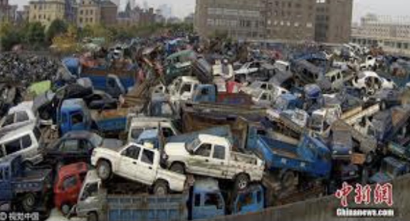路上发生碰撞事故,损坏了外壳,拿到汽车修理厂,本来是可以修复再用,然而修复费与买新替換价钱差不多,这种情况下,多数报废损坏部件。如果是被撞得重一点,虽然可以修复再用,可是经常报废丢弃了事,报废车辆堆积如山,人称汽车坟场。