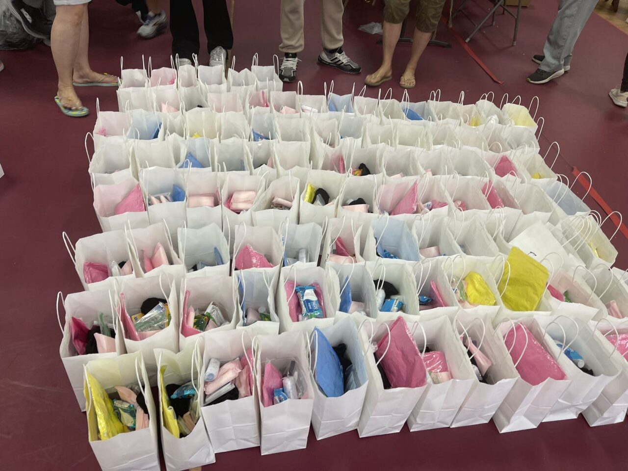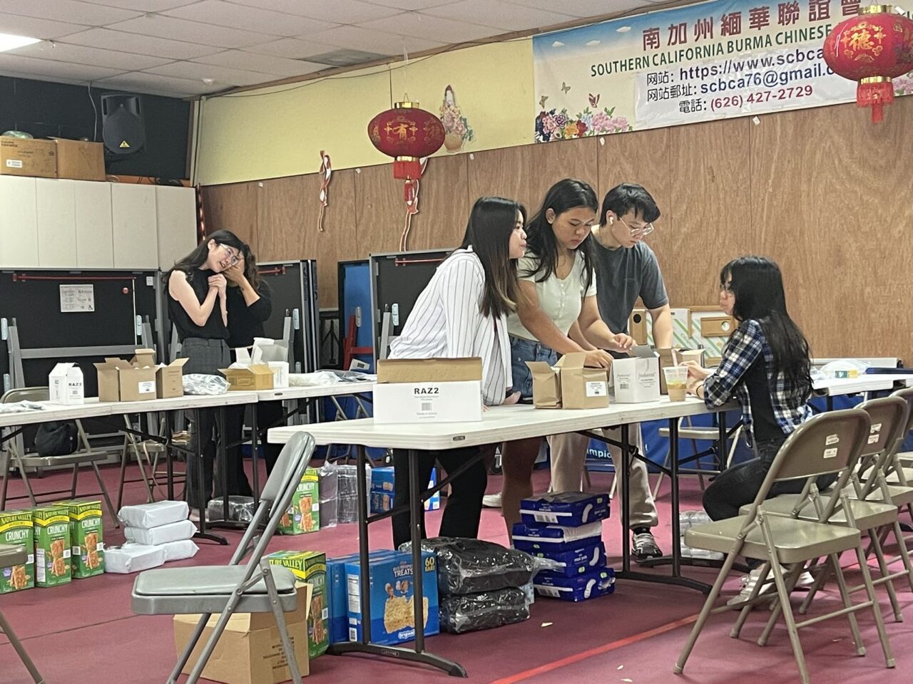 這次捐贈給無家可歸的流浪漢有好多物品與曰用品,其中包括男性內衣、女性內衣、熱毯、雨衣、襪子、超大衛生護墊、潤滑液、毛巾、紙巾還有整套洗漱用品以及一些食品………等等。那天中午,緬華聯誼會青年組 的成員們陸續來到了會場,他們熱情洋溢、聽從指揮、積極配合、分工合作、各盡所能。大家無私奉獻愛心,充分表現了堅強與團結的力量,他們用自己的愛心善舉彰顯了人類的善良,大家齊心協力合作,終於圓滿完成任務。