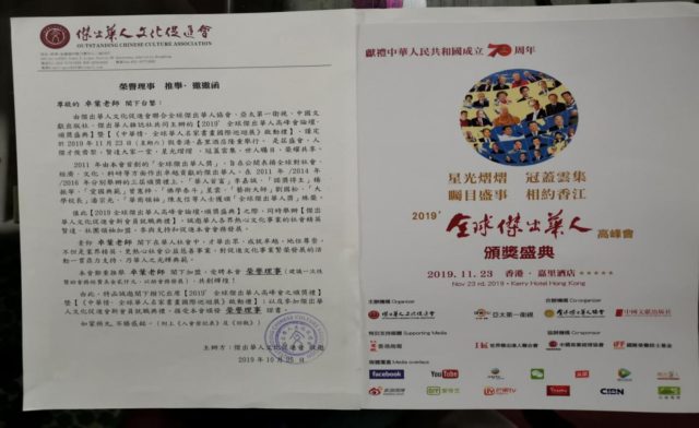 不久,又接到“全球杰出华人文化促进会”执行主席送来的有关聘任为该会“荣誉理事”的邀约函。