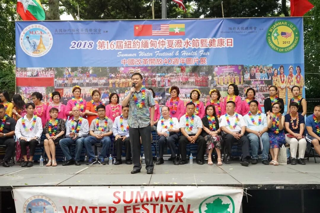 7月15日,第十六届纽约缅甸仲夏泼水节暨健康日、“中国改革开放40年图片展”在纽约曼哈顿罗斯福公园举行。中国驻纽约总领馆王雷副总领事、缅甸常驻联合国代表团参赞Nugh Lin Aung、纽约州、市官员、美东主要侨团代表出席开幕式。近千名民众参加了当天活动。