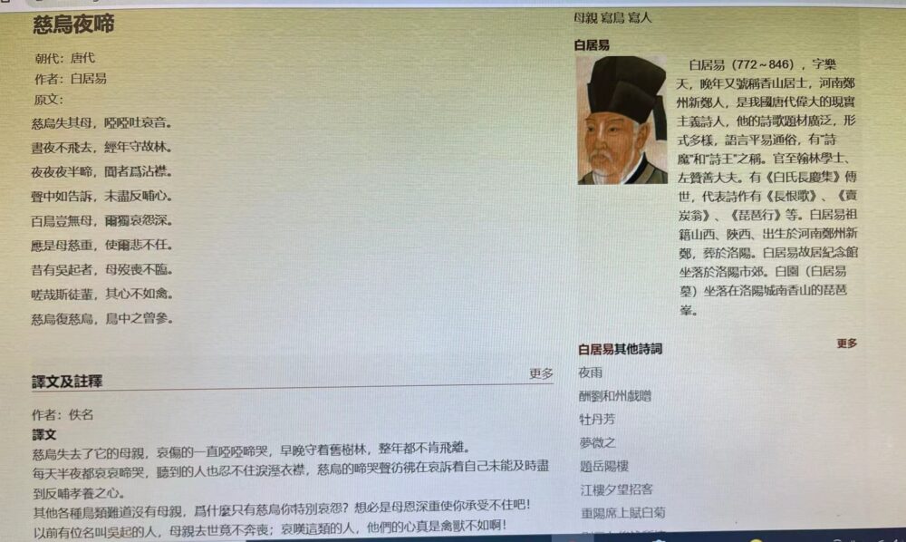 下面是:慈烏夜啼(白居易,唐朝)50和60年代,育成中學五年級的教材,(張文正老師教)