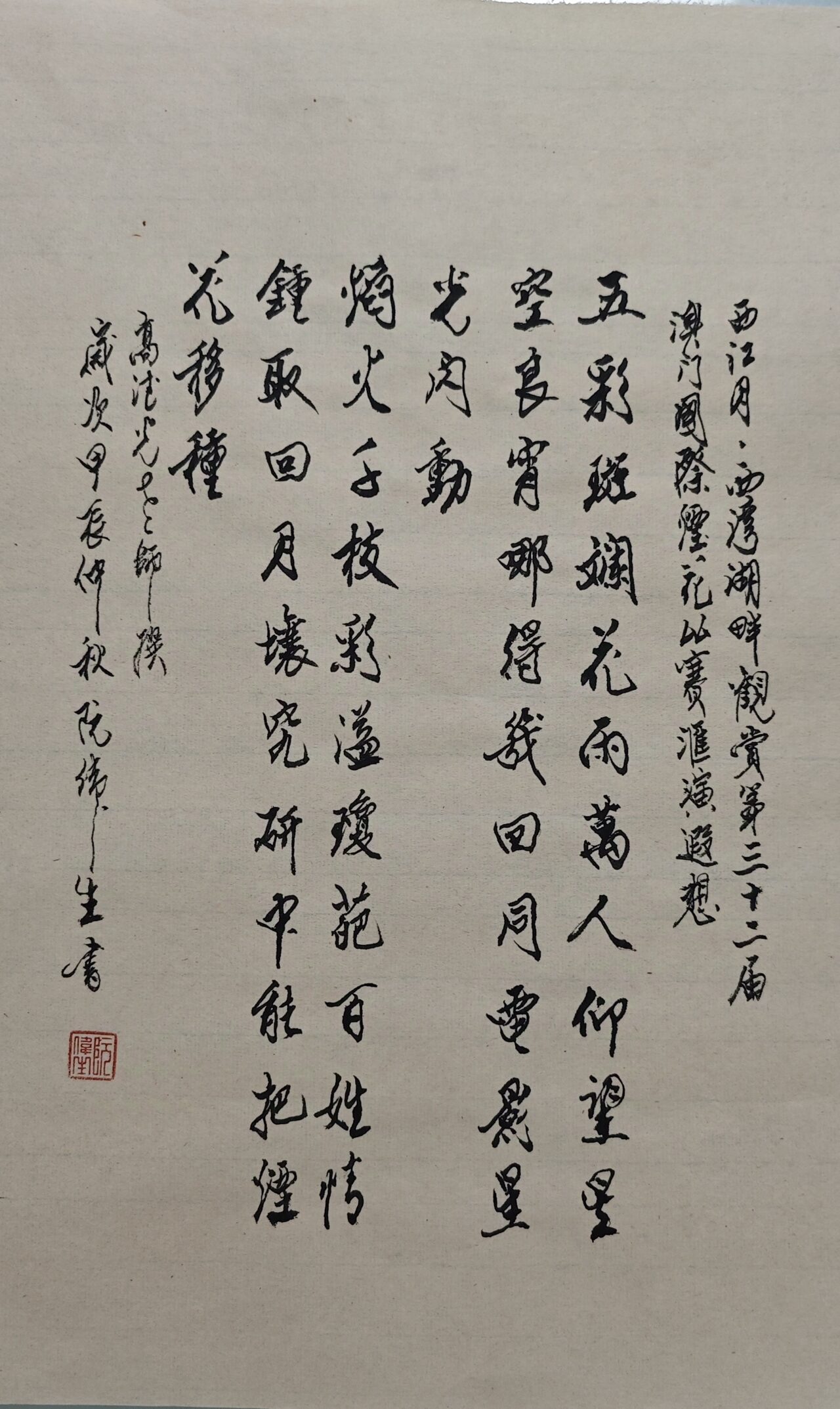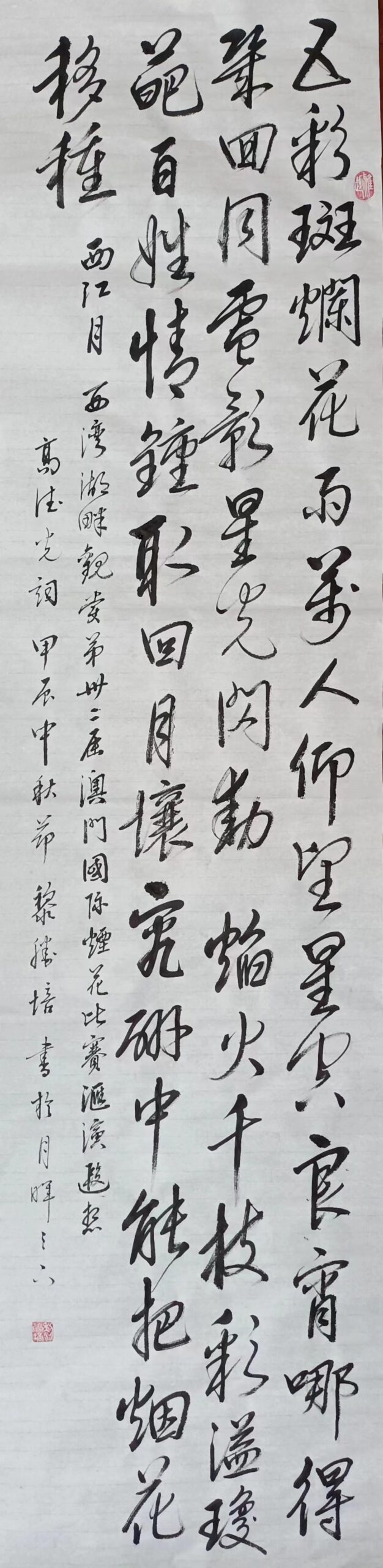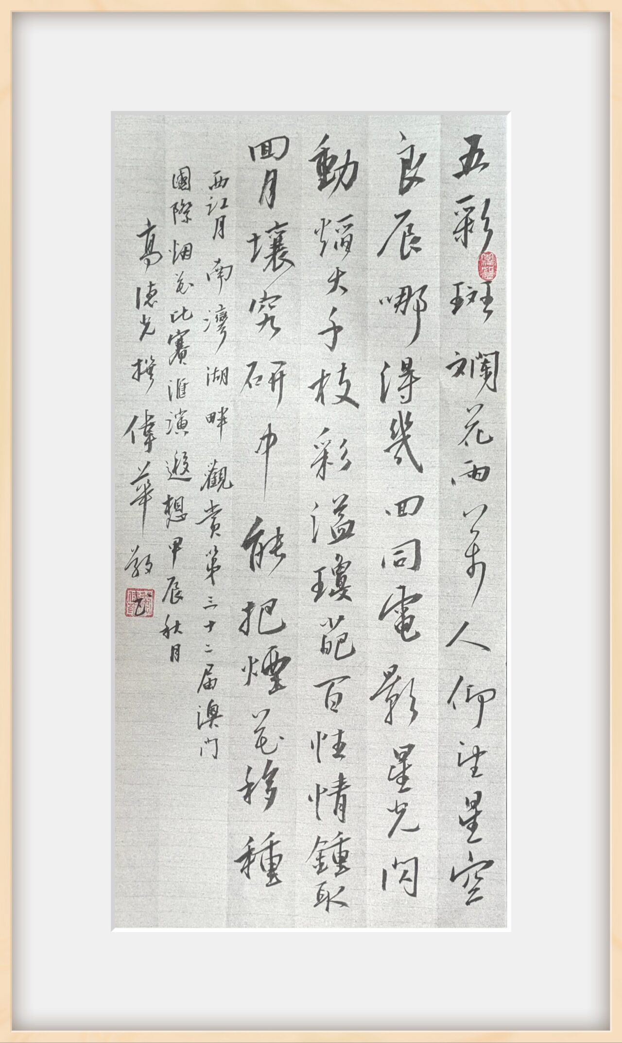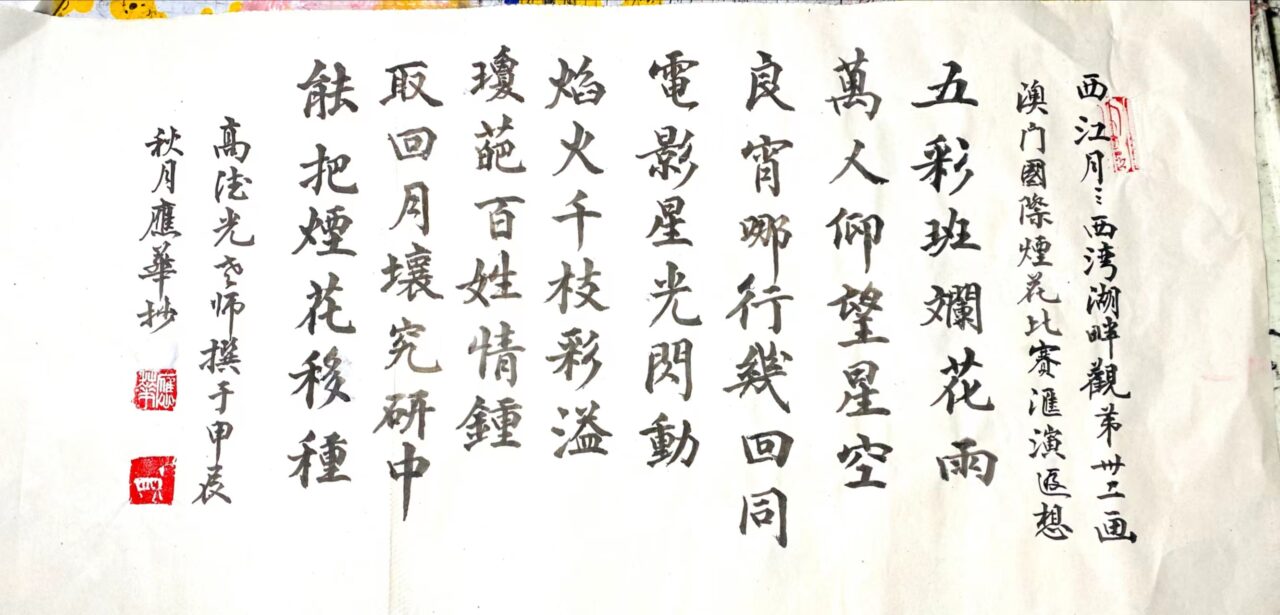 . . 華夏文明今古傳, 楚辭漢賦宋唐篇。 濠江薈萃吟風雅, 葡韻悠揚入管絃。 融滙中西相碰撞, 切磋音律共承宣。 好將世界詩歌節, 砥礪騷壇笑比肩。 书法 一〉馮利發 二〉劉北照 三〉茂松 四〉黎勝培 五〉周永騰 六〉吳錦蓮...