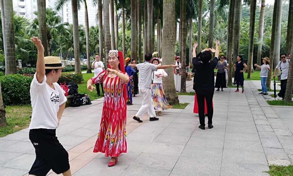 笔挺翠绿的棕榈树园传出欢快的新疆歌曲。装扮鲜丽,舞姿优美的人们全神关注地踩着节拍。