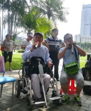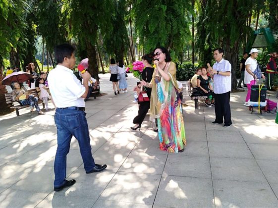 花廊尽处,打扮花俏的李老师在接待游客们,挨个在卡拉OK机前尽情讴歌。我用树叶吹奏了《在希望的田野上》,掌声落下,一位坐在轮椅上的长者邀请我为他伴奏,共同演绎《哎呀妈妈》。歌毕,李老师向听众们介绍我俩,他是深大退休80岁的薛教授。我们交换了名片,一位年轻的音响销售员为我俩拍照留念,并请我抽空到她的店去看看。我请她为我配置一台轻便,适宜树叶吹奏频率的音箱。她豪爽地答应了。