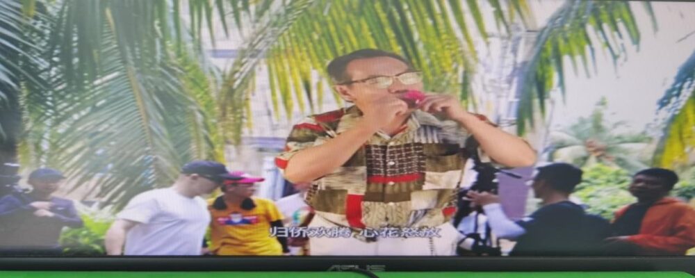 著名歌手平安(左二)、卓忠明与湖南卫视摄制组在国泰红椰拍摄场地