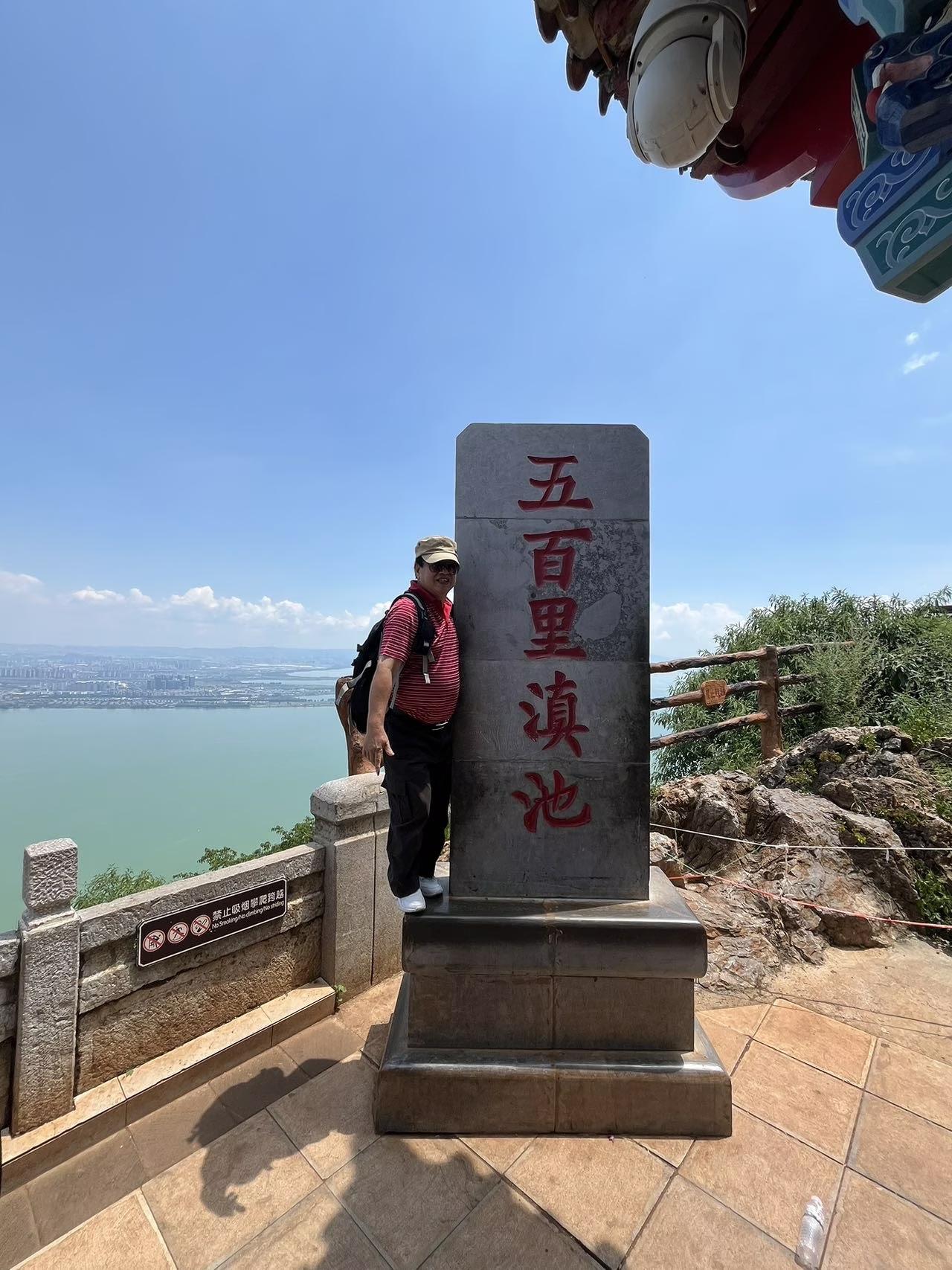 人们说到昆明一定要去西山和石林游览。五十六年前回国到昆明,由于种种原因,没去西山游览。37年前公差到昆明,抽空上了西山,可惜的是因为毛毛细雨,上山的石头台阶非常光滑,真是路难行,走不好摔一跤,那可是大事件,出门在外安全第一哦!只好上到龙门游览区就下山了,没有上到西山之顶——海拔2000多米的凌虚阁,很遗憾!这次到西山,方便很多了。乘封闭式的缆车到龙门游览区,再乘敞开式的缆车到山上缆车露天站,再沿着人工栈道,缓缓走到凌虚阁。与37年前的西山一游相比较,那时是年富力壮,因为下雨路滑,没上到顶,留下遗憾。现在却是因为旅游服务设施完善,人性化的人工栈道设置,使我们这群银发稀疏鬓毛白白的耆年者,步履蹒跚,相互扶持,拄着拐杖,伴随着拐杖敲击地板的声音,缓步爬上凌虚阁。真是不可能变成可能。终于登上凌虚阁,了结了一个心愿!视乎也感受到了“一登龙门身价百倍”的自豪!
